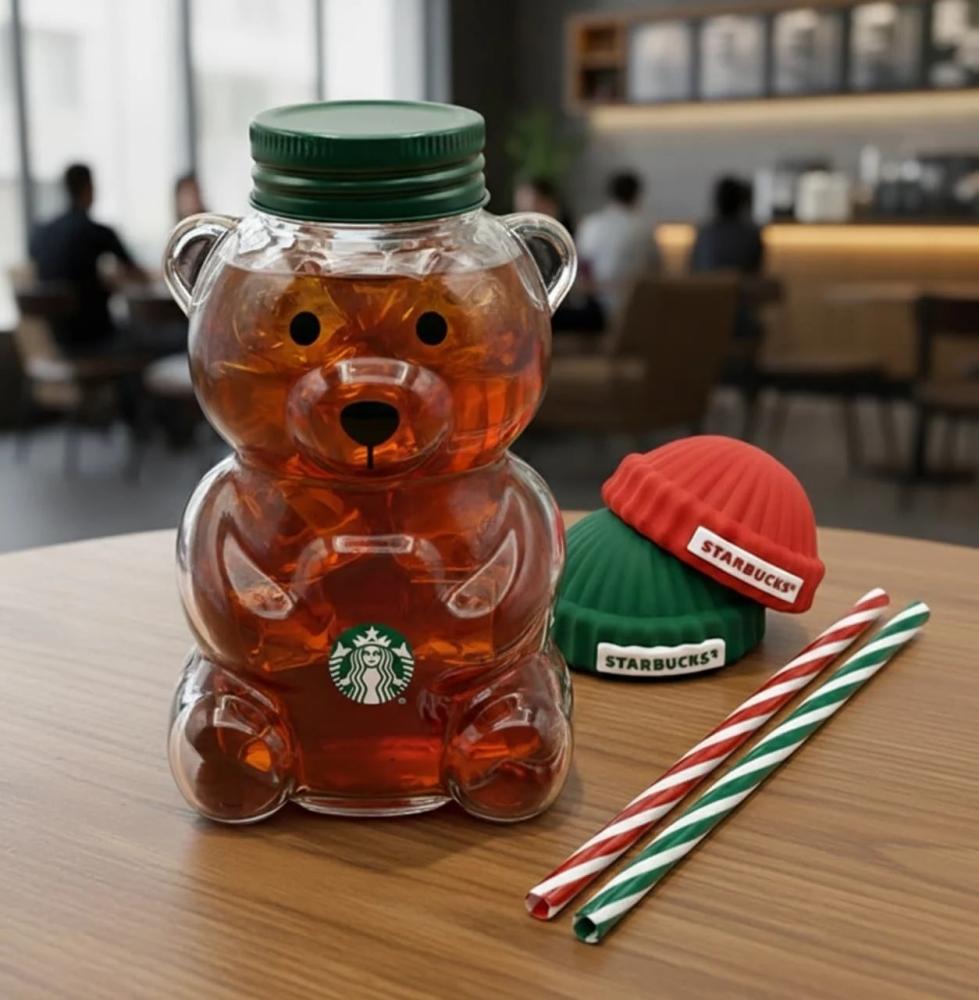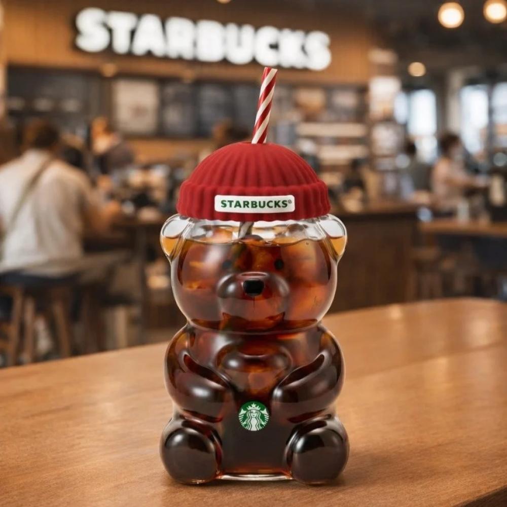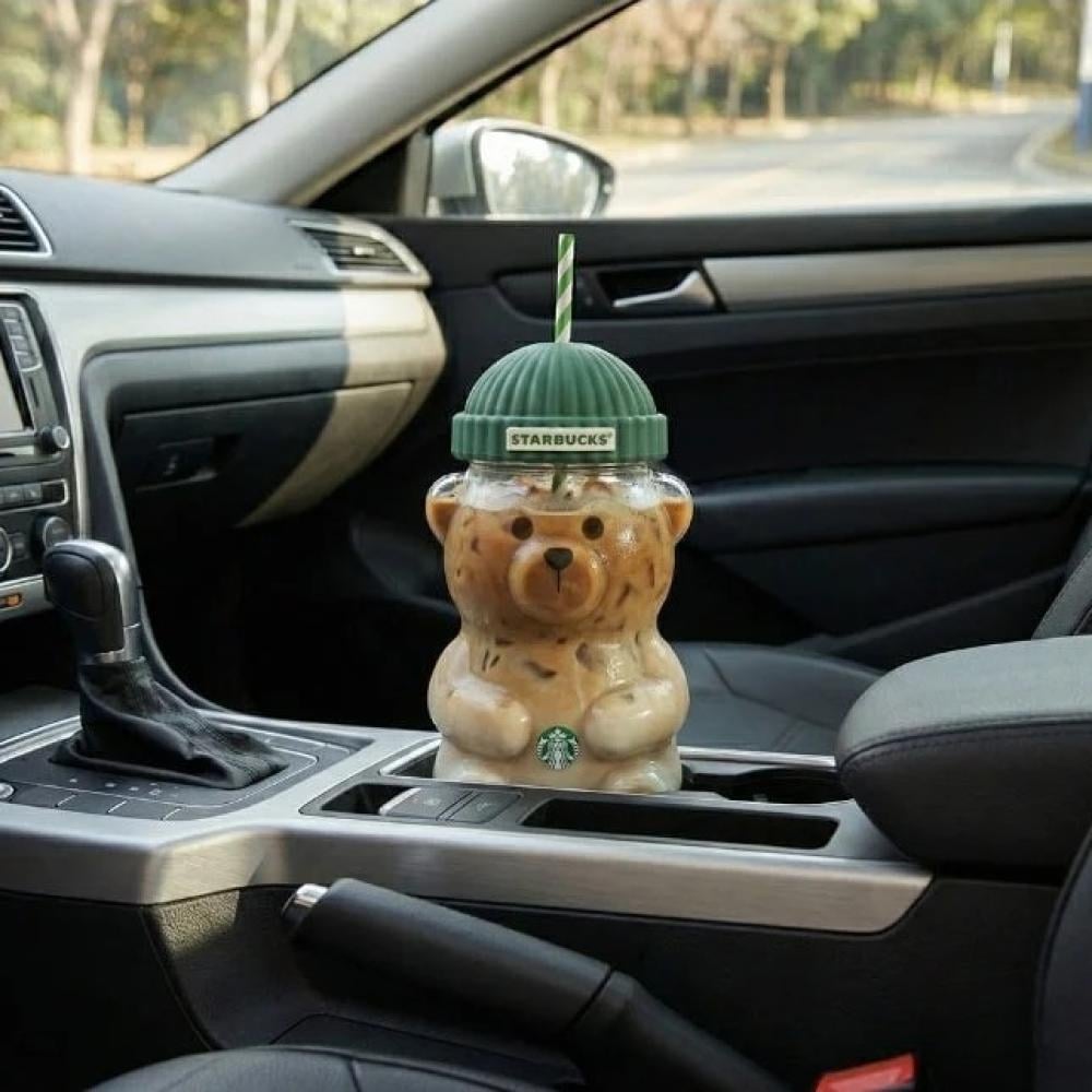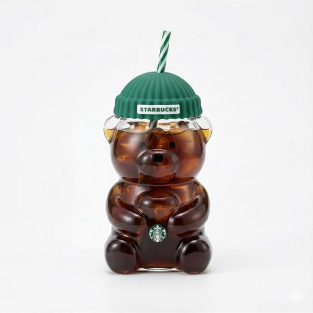 كوب قهوة زجاجي بتصميم دب تيدي – كوب عصري لعام 2025 مع ماصة وغطاء (Teddy Bear Cup 2025)