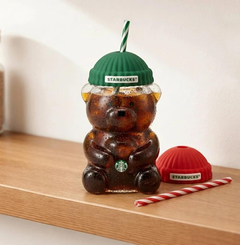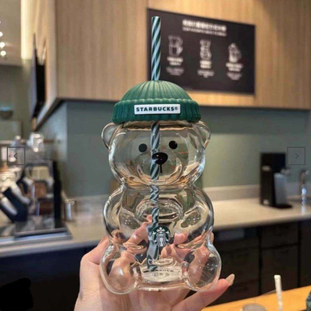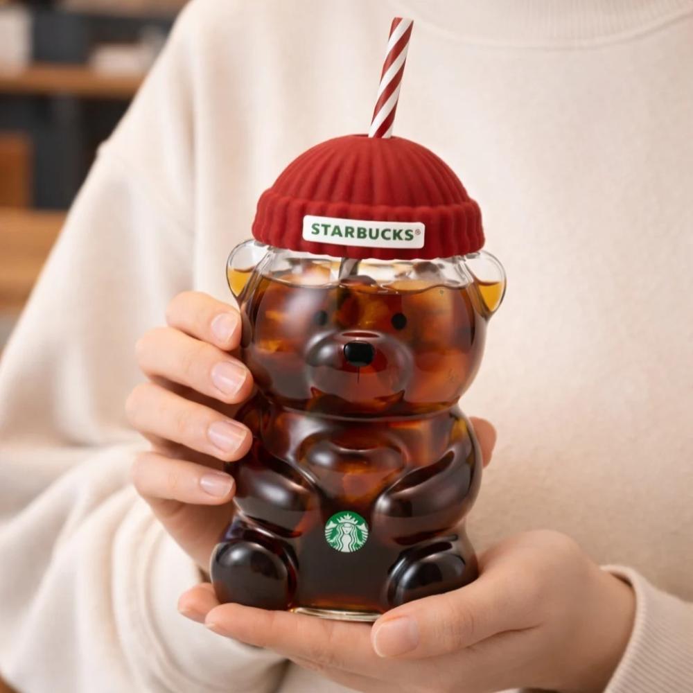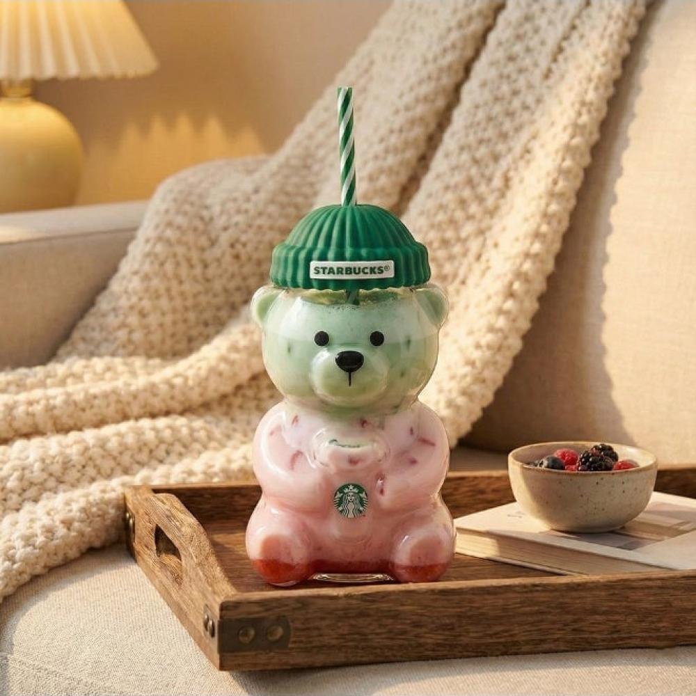 كوب قهوة زجاجي بتصميم دب تيدي – كوب عصري لعام 2025 مع ماصة وغطاء (Teddy Bear Cup 2025)